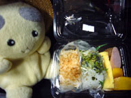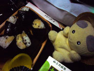 夕食は途中で配られた天むす弁当。